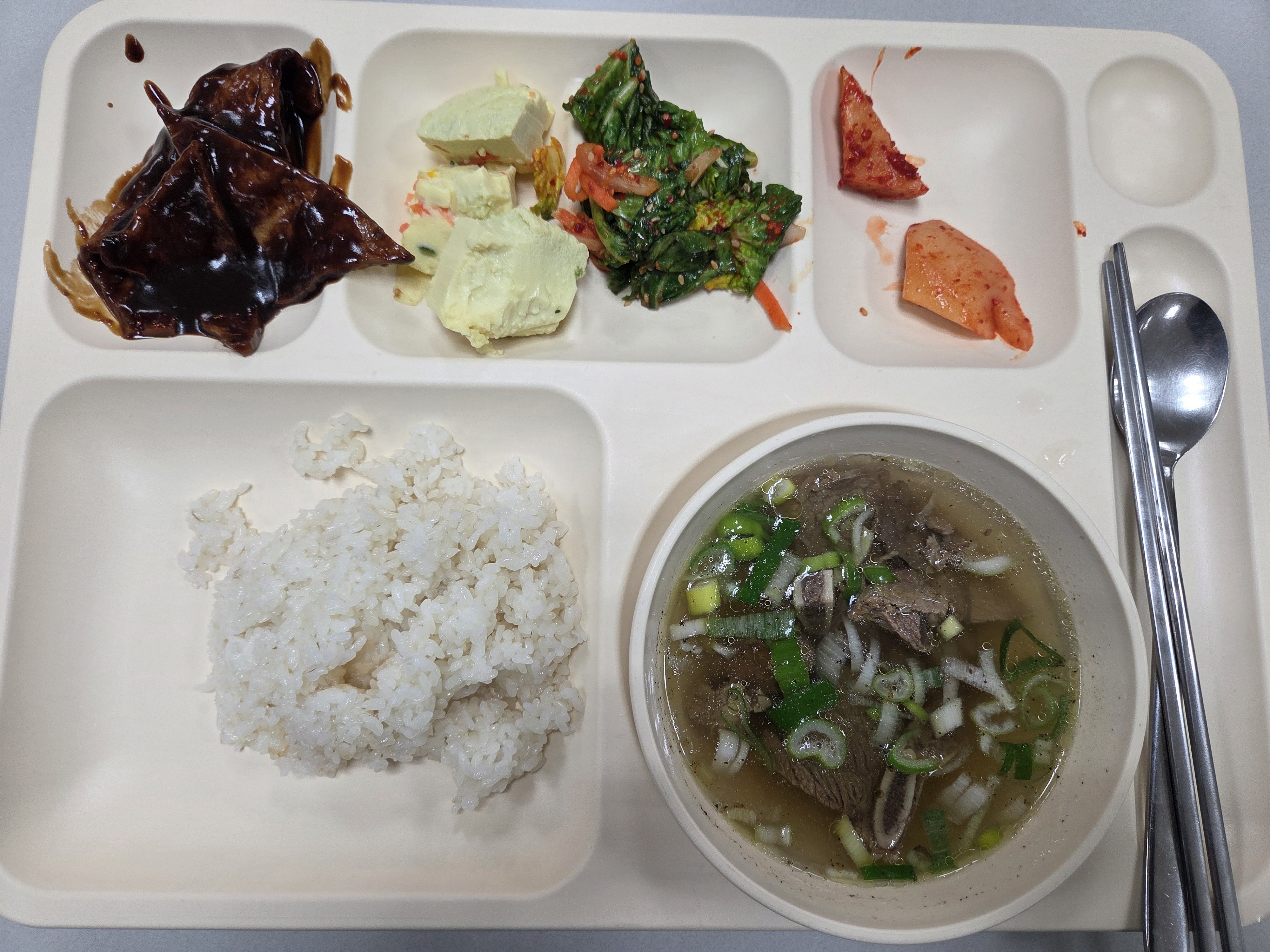 백미밥/잡곡밥 미니갈비탕 고등어고추장구이 짜장떡볶이 야채계란찜 봄동겉절이 석박지 그린샐러드 황도 온매실차 | ![]() | |