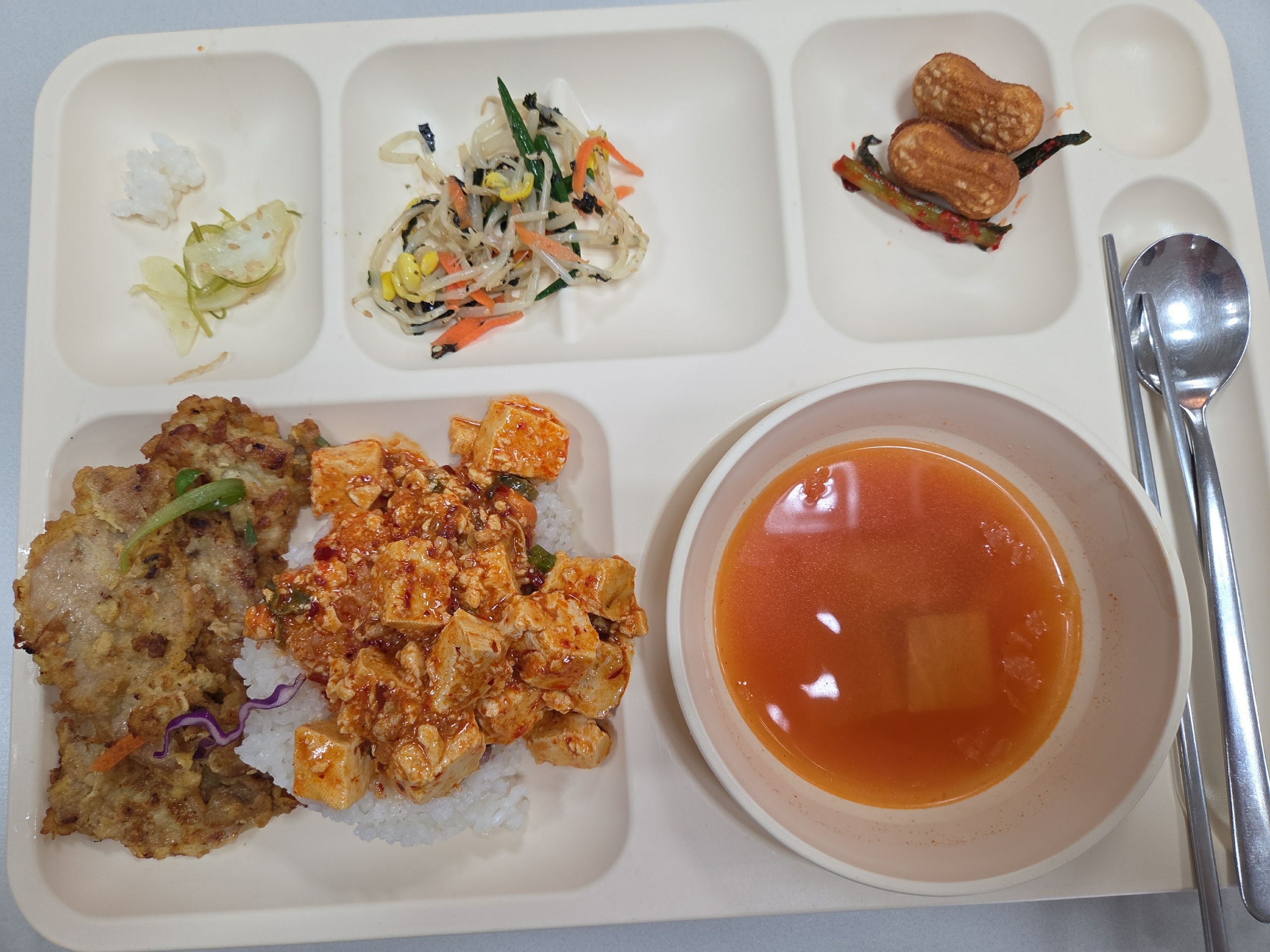| 2026-04-27 (월) | 백미밥/흑미밥 어묵김치국 돼지고기육전&파채무침 마파두부 미역줄기볶음 김가루콩나물무침 열무김치 그린샐러드 땅콩빵 요구르트에이드 | ![]() | |